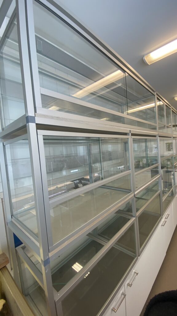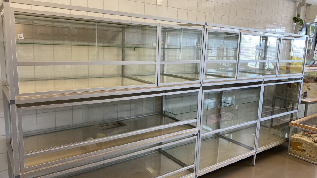 Terraariot ovat vedenpitäviä kiskoon tai verkkoon asti, jonka korkeuden voit määritellä. Verkkoja on kaksi: takalasissa ja katossa. Aukon koko on n.10cm